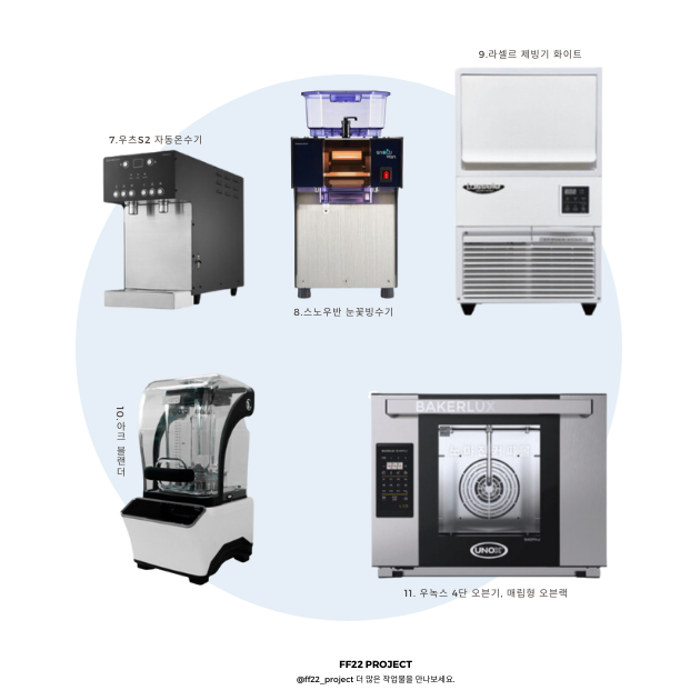 또한, FF22 프로젝트가 가장 자신 있게 제공하는 서비스는 장비 컨설팅입니다. 매장 규모, 주방 크기, 주변 상권, 그리고 카페의 특성에 맞춰, 정말 필요한 장비를 추천해드리고 있어요.